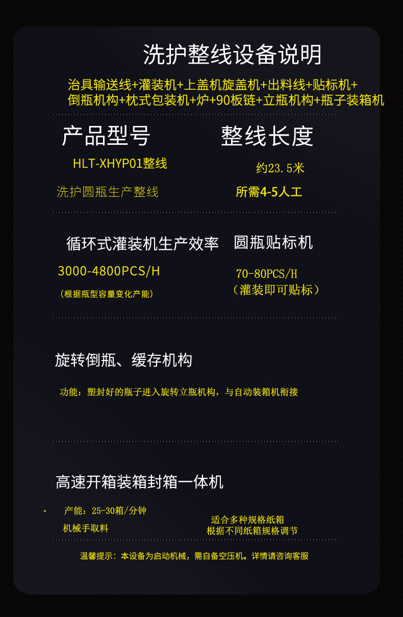 整線組成設(shè)備:治具輸送線+灌裝機(jī)+上蓋機(jī)旋蓋機(jī)+出料線+貼標(biāo)機(jī)+倒瓶機(jī)構(gòu)+枕式包裝機(jī)+爐+90板鏈+立瓶機(jī)構(gòu)+瓶子 裝箱機(jī)