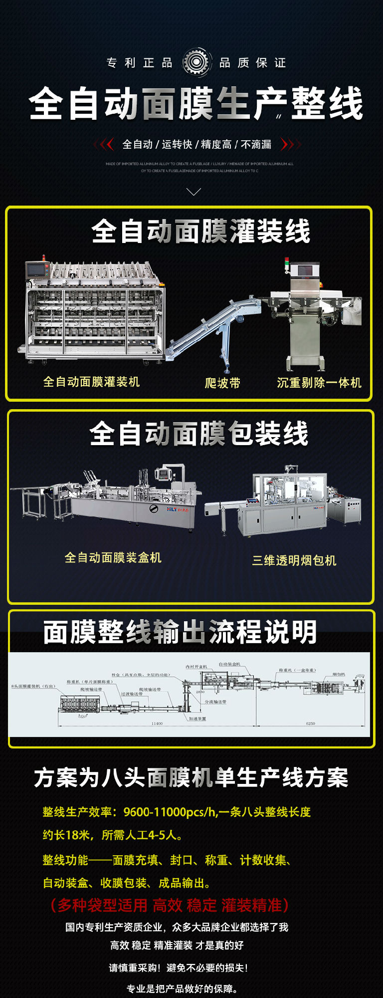 全自動面膜線看似增加成本,然從整體考慮,一條面膜線預計60-120萬成本(根據不同配置),定制另議;然從簡單的這摸到灌裝,包裝、裝箱,從原來的一條線20幾個人,我們3-5人可以操作完成,而且輕松,產量更是可觀;因現實上班的是80-00后人員,用上機械化,給公司節(jié)省了社保、人員工資、管理和安全成本等。