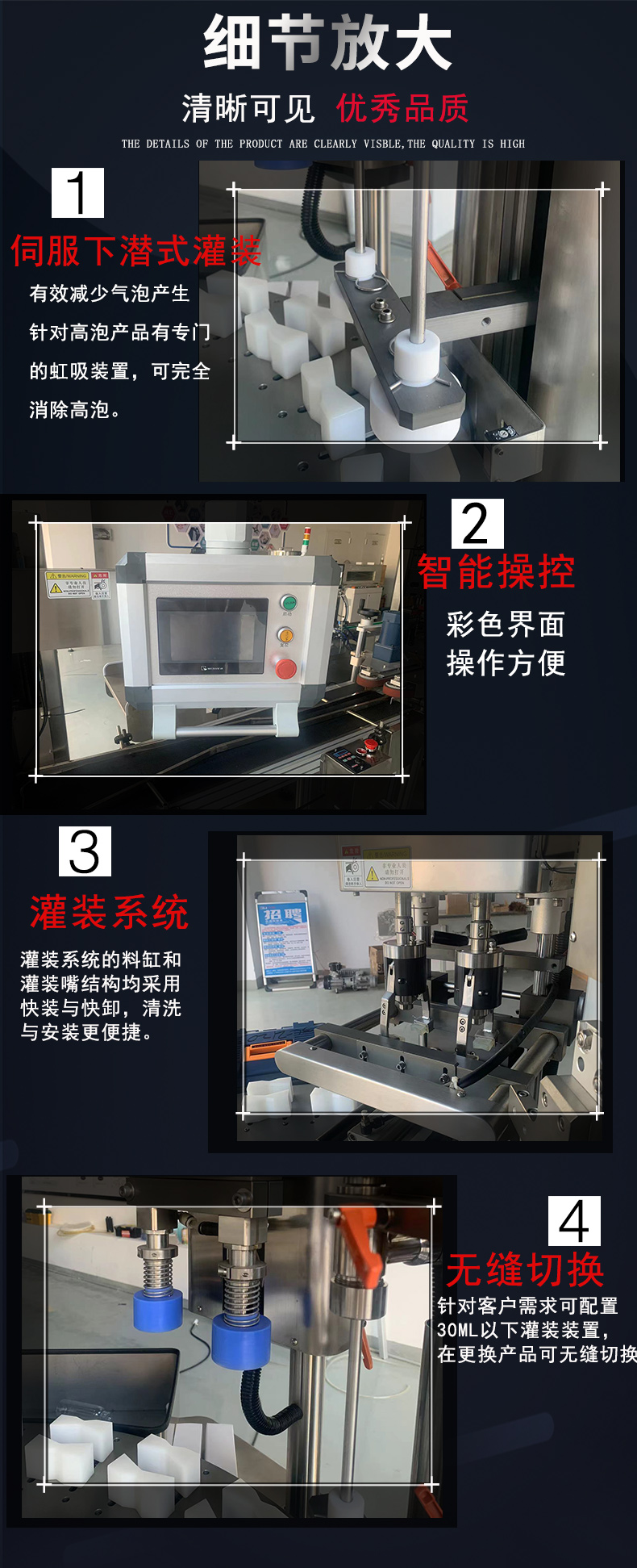 本產(chǎn)品是從事面膜產(chǎn)品的充填和封裝一體化的專業(yè)設(shè)備,具有衛(wèi)生,環(huán)保,高效,節(jié)省人力成本,占地面積小等特點(diǎn)。全觸摸屏+plc控制,動(dòng)作高效,迅速,簡潔,四頭理論速度可以達(dá)到7200片/小時(shí),十頭更多