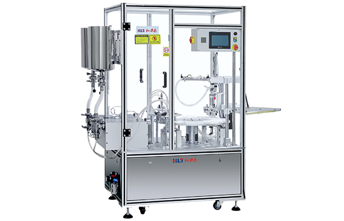 工作流程:手動放瓶—自動灌料-手動放內圈-自動壓內圈—抓手取瓶放至生產線。
